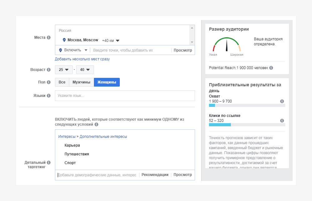 Добавим интересы: карьера, путешествия, спорт. Получим цифру — 1 900 000.