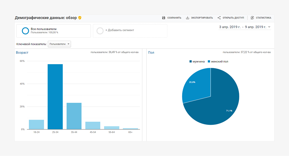 В системах аналитики вы также можете изучить демографические данные: пол и возраст. Мужчины и женщины мыслят по-разному, поэтому рекламные кампании могут отличаться.