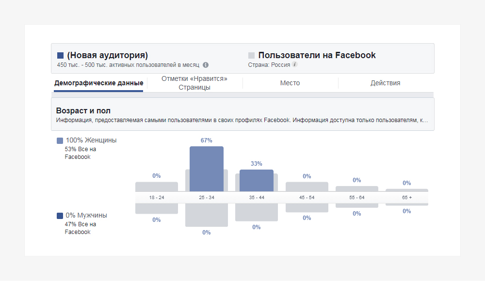 Перейдем в рекламный кабинет Ads Manager. Указываем пол — женщины, регион — Москва, возраст от 25 до 40 лет. Результат — 3 000 000 человек.