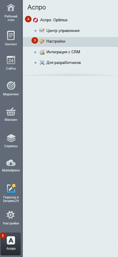 Чтобы использовать настройку self-hosted шрифтов, в административной части сайта необходимо перейти в Аспро (1) → Аспро: Optimus (2) → Настройки (3).
