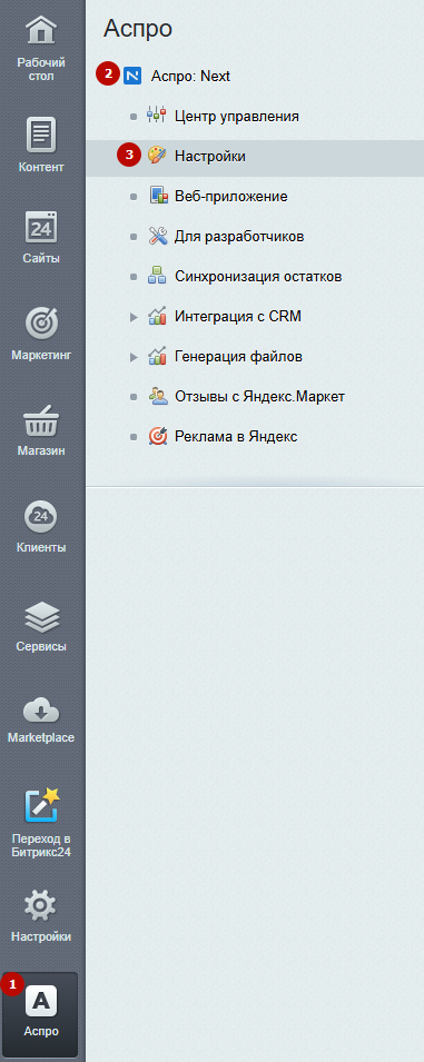 Для настройки капчи зайдите в административную часть сайта. Проделайте путь: Аспро (1) → Аспро: Next (2) → Настройки (3).