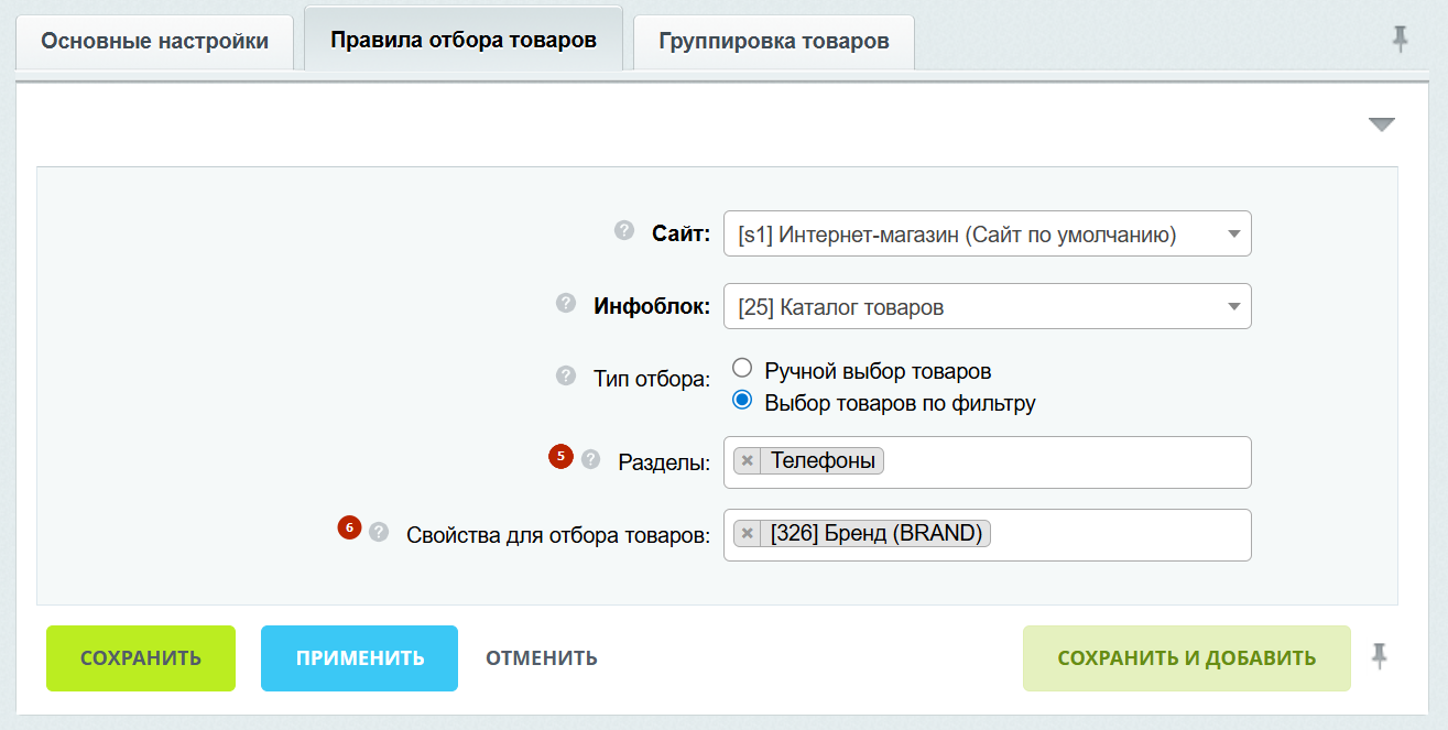 При варианте «Выбор товаров по фильтру» привяжите раздел (5) и свойства для отбора товаров (6). Например, бренд или модель.