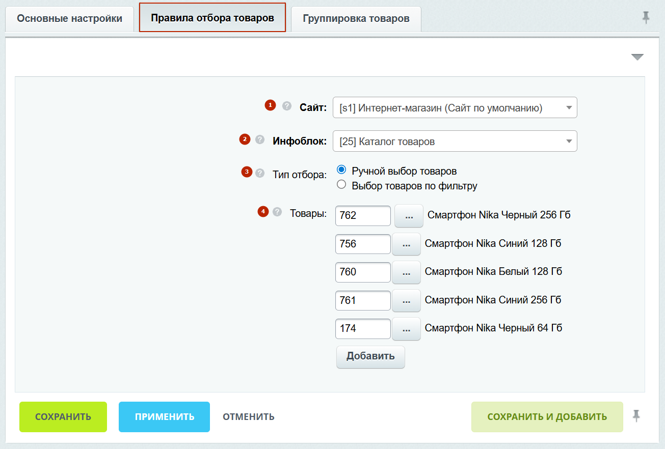 Есть 2 варианта выбора товаров: вручную и по фильтру (3). При варианте «Ручной выбор товаров» добавьте активные товары (4).