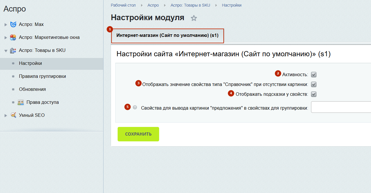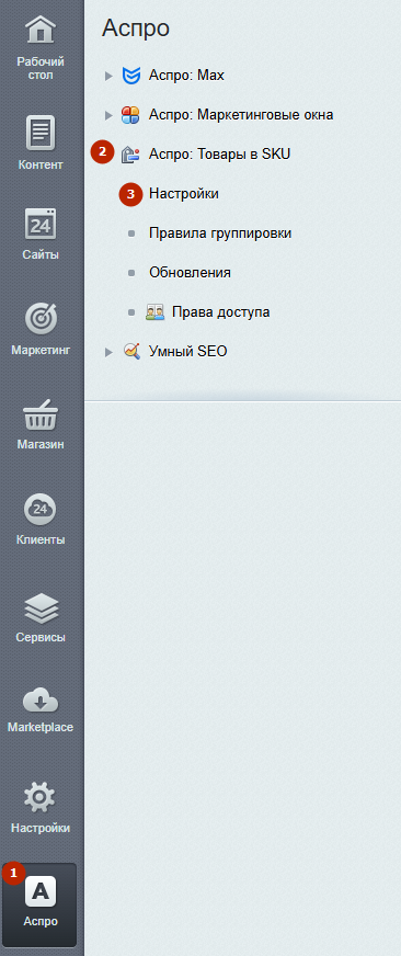В административной части сайта перейдите в Аспро (1) → Аспро: Товары в SKU (2) → Настройки (3).