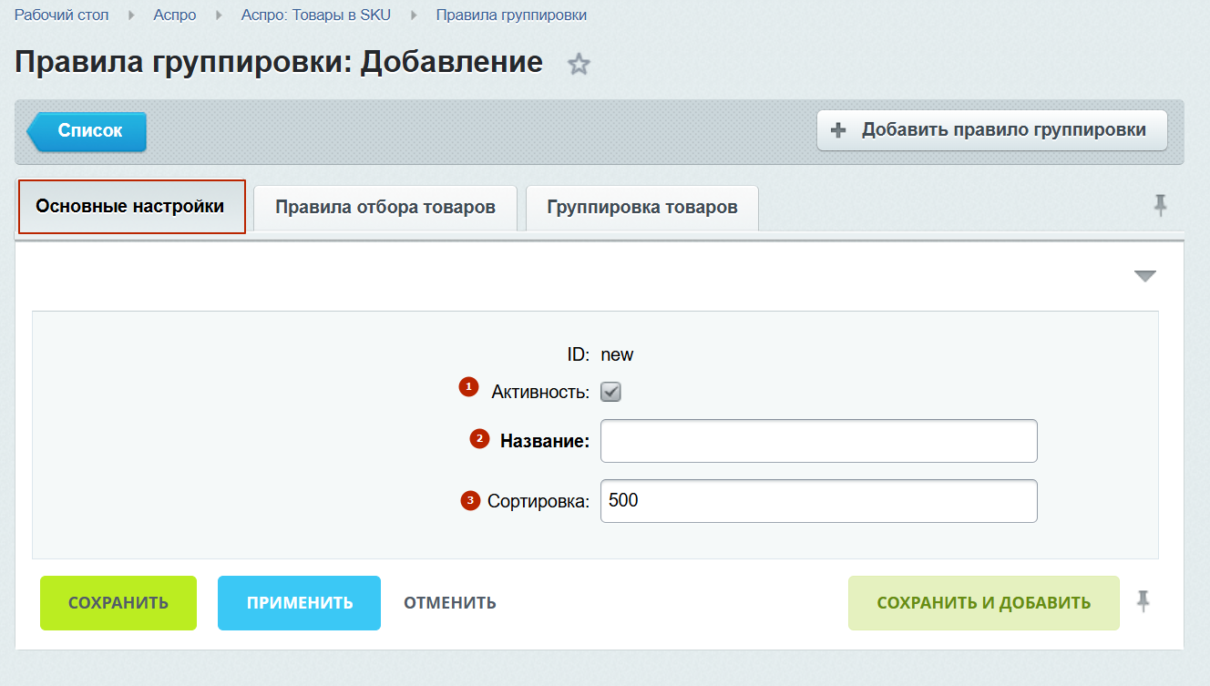 В основных настройках задайте активность (1), дайте название для дальнейшей идентификации правила (2) и укажите сортировку (3).