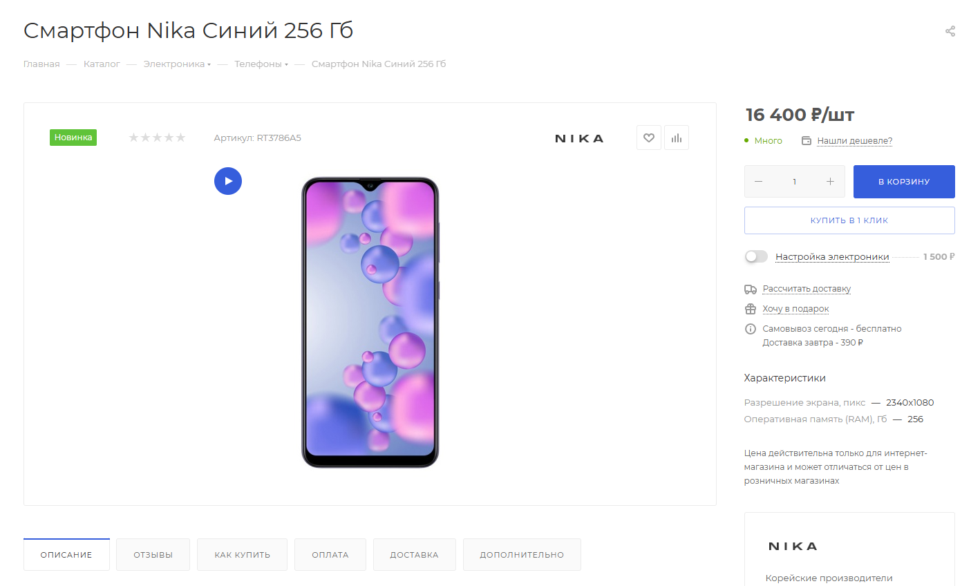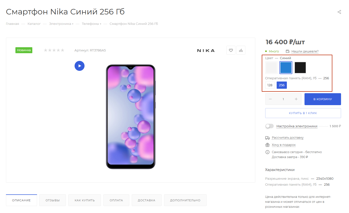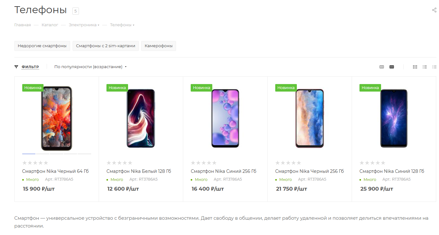 Чтобы наглядно рассмотреть настройки модуля, определим задачу: в нашем каталоге 5 смартфонов Nika разных цветов и оперативной памяти.