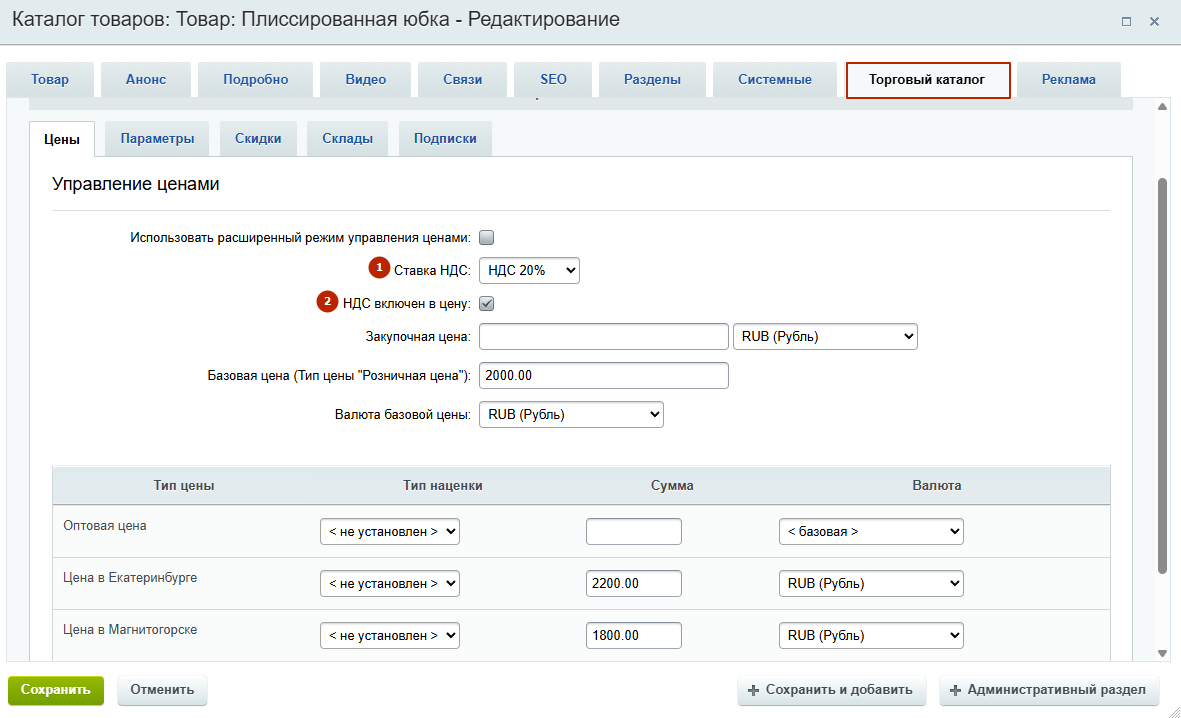 Затем перейдите в настройки конкретного товара. Во вкладке «Торговый каталог» найдите поле «Ставка НДС» (1) и выберите подходящий вариант. Затем поставьте галку в поле «НДС включен в цену» (2). Сохраните изменения.