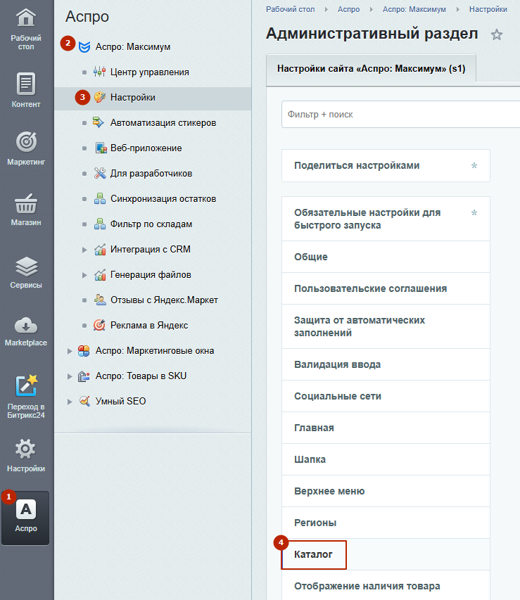 Чтобы вывести информацию об НДС, в административной части сайта перейдите в Аспро (1) → Аспро: Max (2) → Настройки (3) → Каталог (4).