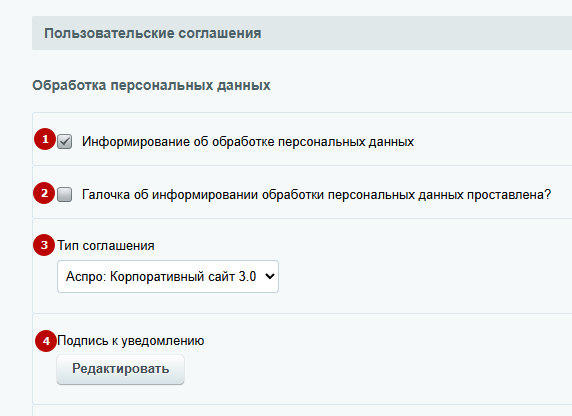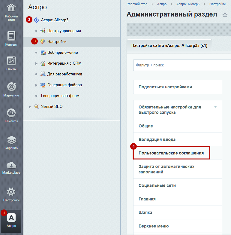 Чтобы настроить обработку персональных данных, в административной части сайта перейдите в Аспро (1) → Аспро: Allcorp3 (2) → Настройки (3) → Пользовательские соглашения (4).