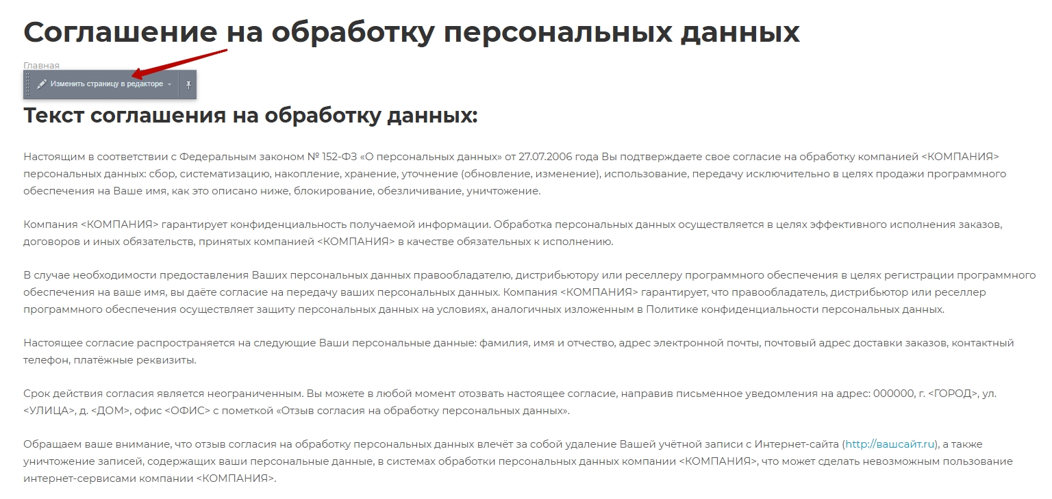 Перейдите на страницу документа «Соглашение на обработку персональных данных» в публичной части сайта. В режиме правки наведите указатель на текст и нажмите на всплывающую кнопку «Изменить страницу в редакторе» (Название файла: /include/licenses_detail.php). Отредактируйте содержимое и сохраните изменения.