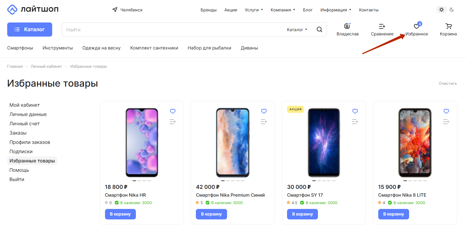 В решении Аспро: Лайтшоп реализован отдельный раздел с избранными товарами. Ваши клиенты смогут сохранить понравившуюся им продукцию, а администраторы — просмотреть ее. Раздел отделен от корзины и расположен в личном кабинете.