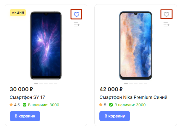 Чтобы добавить товар в избранное, пользователю достаточно нажать на иконку с сердечком в карточке с продуктом. Если товар уже добавлен, то иконка окрашена синим цветом.