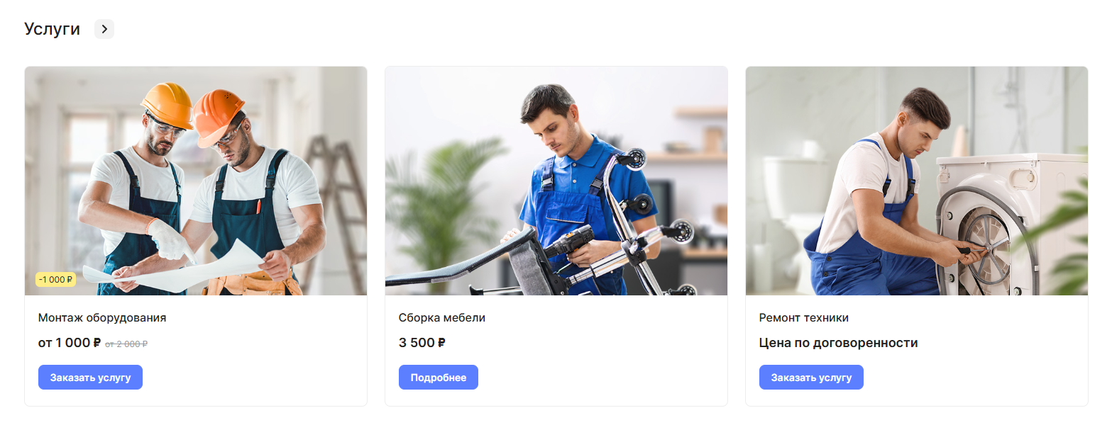 С версии Аспро: Лайтшоп 2.7.0 на главной странице вы можете отобразить услуги компании. Добавляйте блок с услугами, чтобы посетители сайта могли сразу понять сферу вашего бизнеса и то, чем вы занимаетесь.