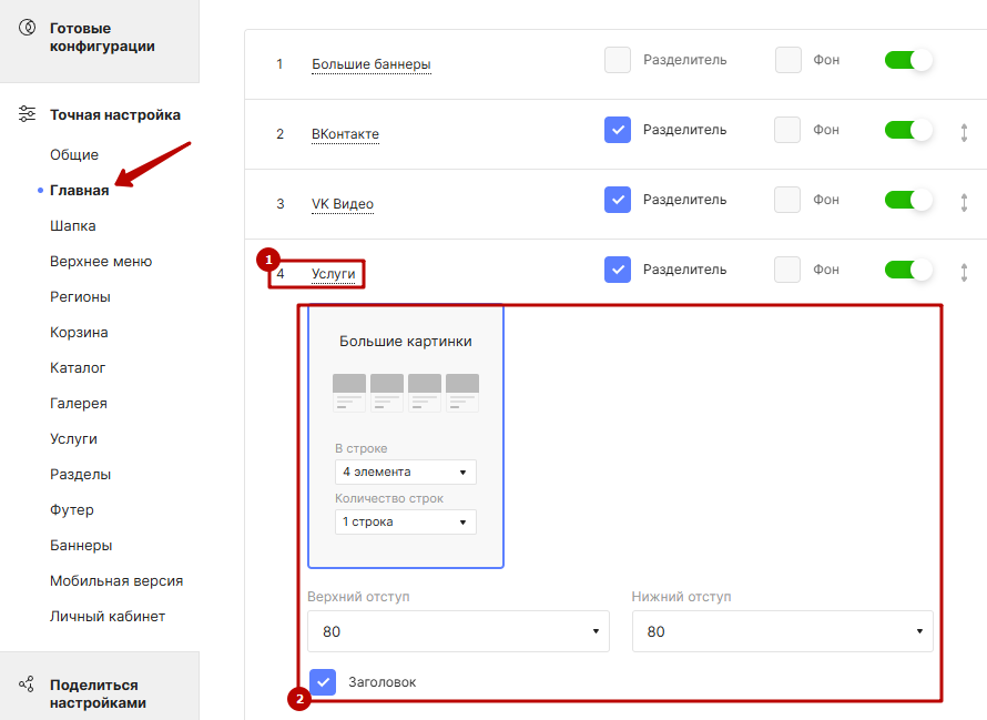 Перейдите в «Точную настройку», далее в раздел «Главная». В списке блоков главной страницы найдите пункт «Услуги» (1). Раскройте пункт и настройте отображение блока (2).
