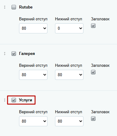 В разделе «Главная» поставьте галку напротив пункта «Услуги», чтобы отобразить его на главной странице.