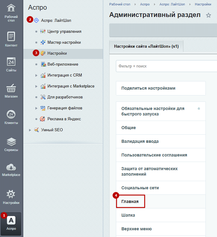 Для выбора подходящего типа блока необходимо перейти в Аспро (1) → Аспро: Лайтшоп (2) → Настройки (3) → Главная (4).