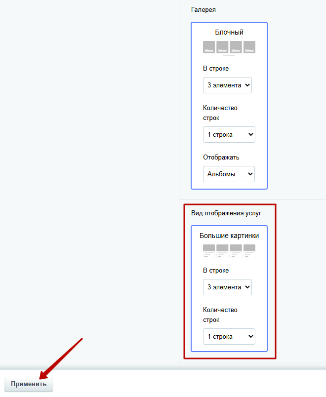 Далее прокрутите бегунок до «Вид отображения услуг». Выберите нужное и нажмите «Применить».