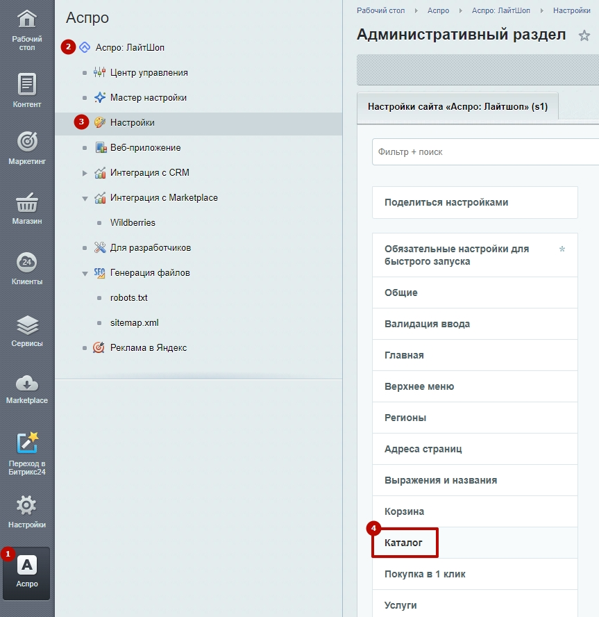 Перейдите в административную часть сайта и проделайте путь: Аспро (1) → Аспро: ЛайтШоп (2) → Настройки (3) → Каталог (4).