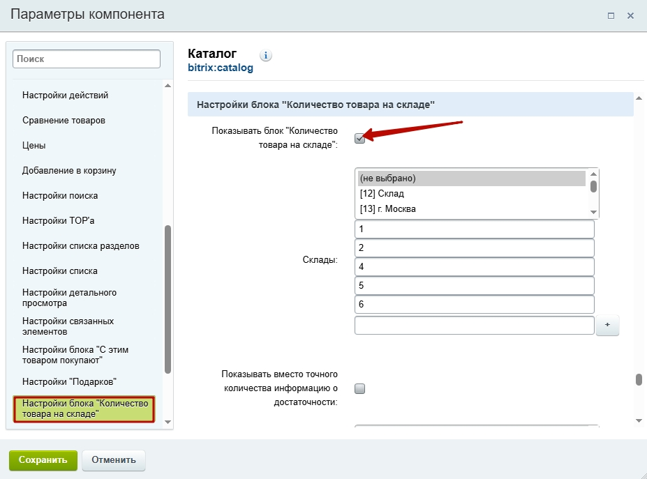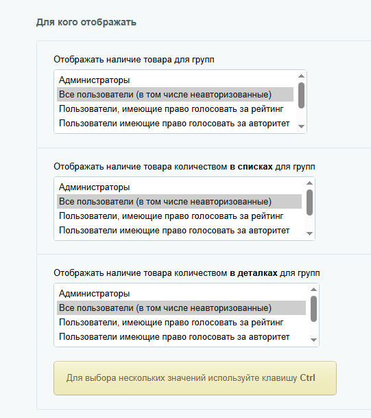 В блоке «Отображать наличие товара для групп» выберите группы пользователей, которые увидят наличие. Например, только оптовые покупатели и администраторы. С версии 2.5.3 отображать наличие товара количеством можно в списках и деталках.