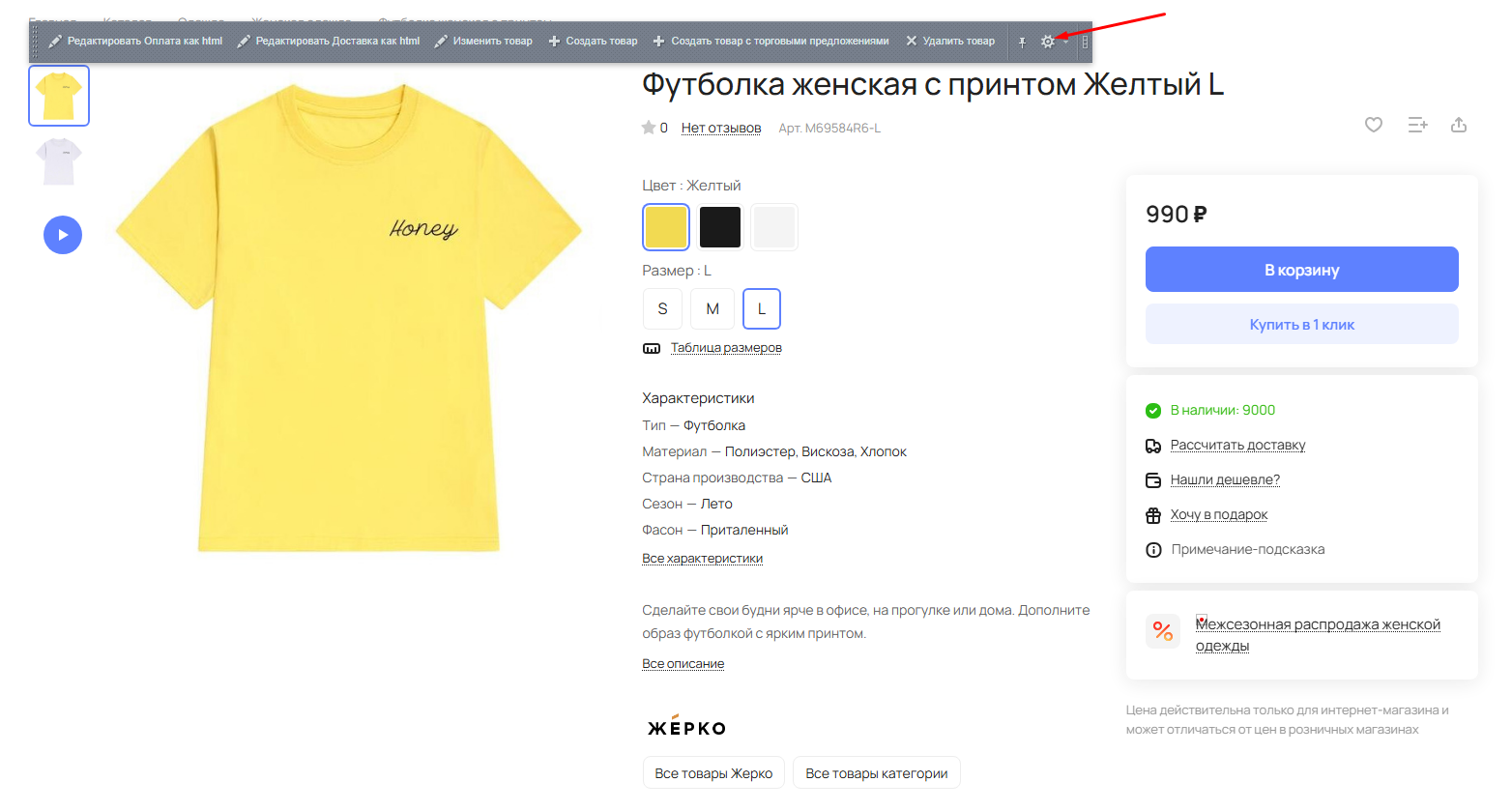 Чтобы настроить отображение наличия на детальной карточке товара, перейдите в публичную часть сайта. В режиме правки наведите на область страницы и нажмите на шестеренку.
