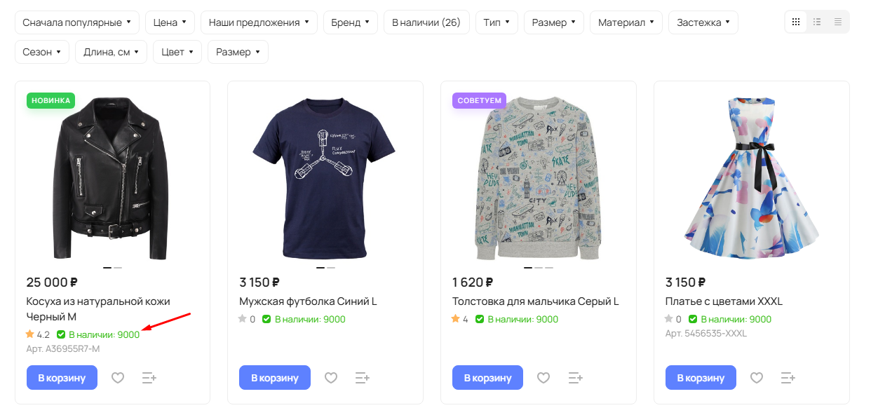 Наличие может отображаться везде, где выведен товар. Например, в лучших предложениях на главной, акциях или блоге.