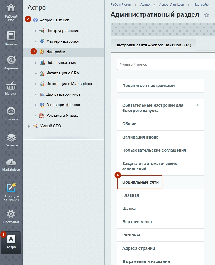 Аспро (1) → Аспро: ЛайтШоп (2) → Настройки (3) → Социальные сети (4).