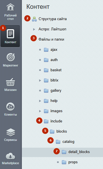 Для создания кастомных блоков потребуются навыки работы с кодом. Чтобы создать файл для блоков в каталоге, проделайте путь: Контент (1) → Структура сайта (2) → Файлы и папки (3) → include (4) → blocks (5) → catalog (6) → detail_blocks (7).