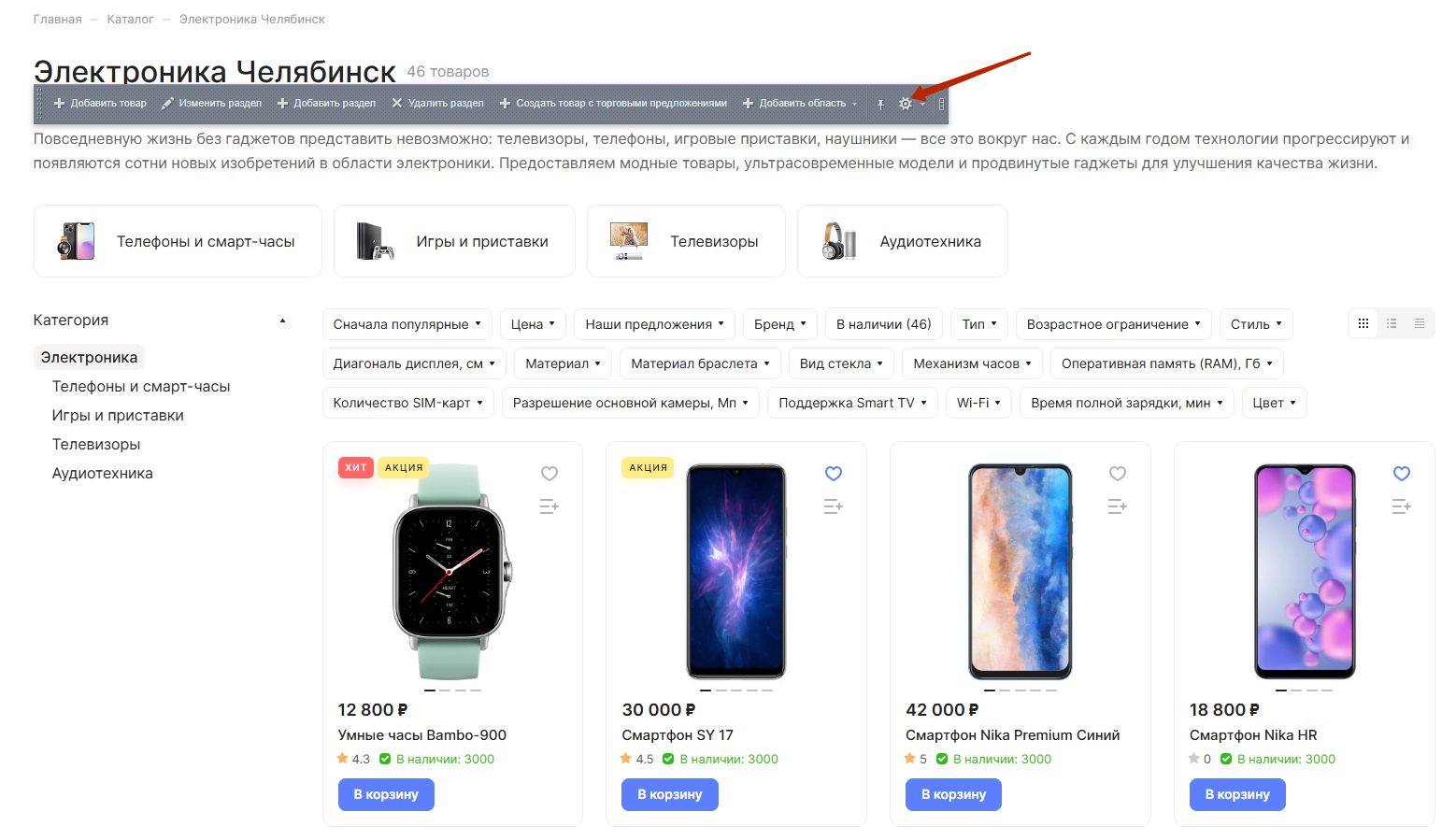 Вернитесь в публичную часть сайта. В режиме правки наведите курсор на область каталога, а затем нажмите на шестеренку в панели.