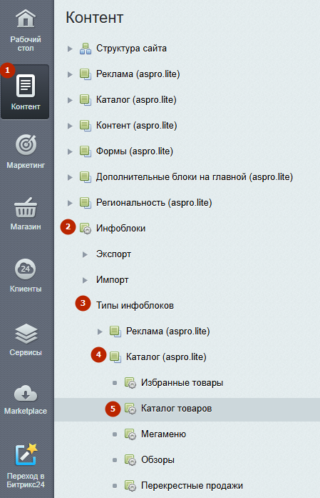 Для создания нового свойства в административной части перейдите в Контент (1) → Инфоблоки (2) → Типы инфоблоков (3) → Каталог (aspro.premier) (4) → Каталог товаров (5).