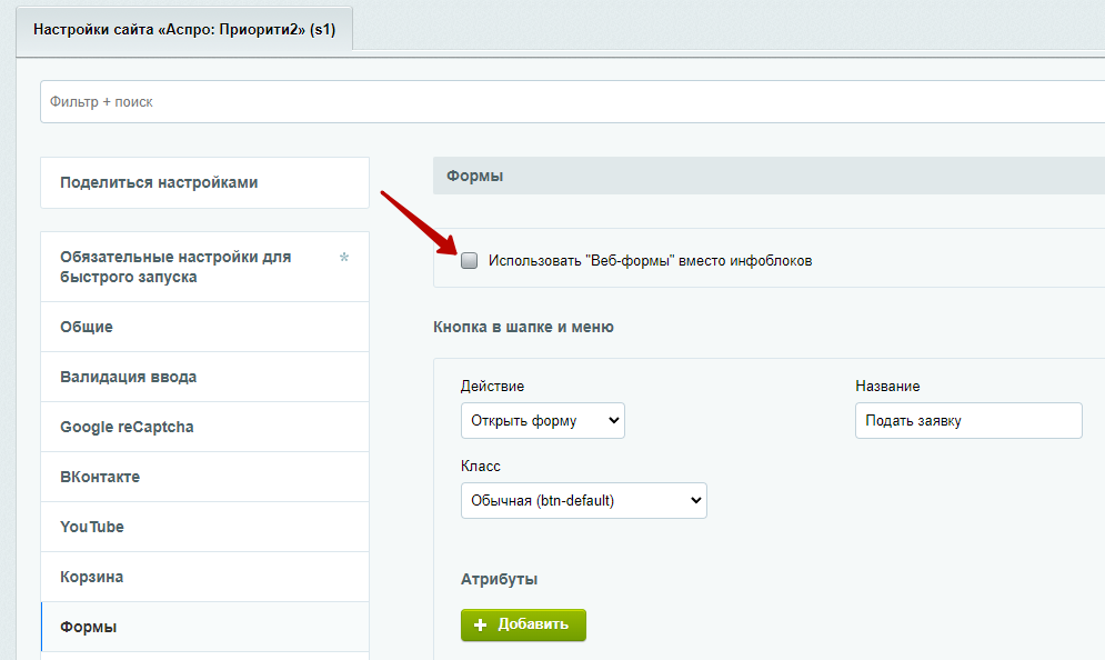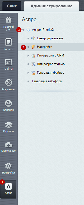 Переключить работу форм обратной связи на инфоблоки можно в Аспро (1) → Аспро: Priority2 → Настройки (3).