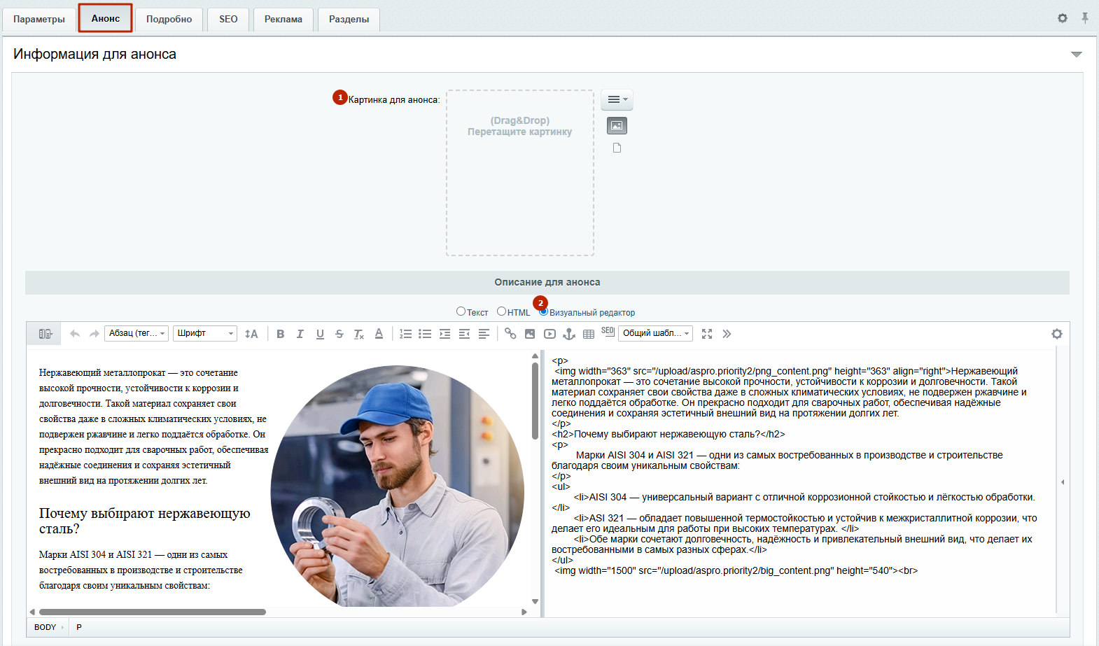 На вкладке «Анонс» загрузите картинку (1) и задайте описание для анонса (2). Картинка будет располагаться рядом с текстом анонса после баннера и блока с тизерами.
