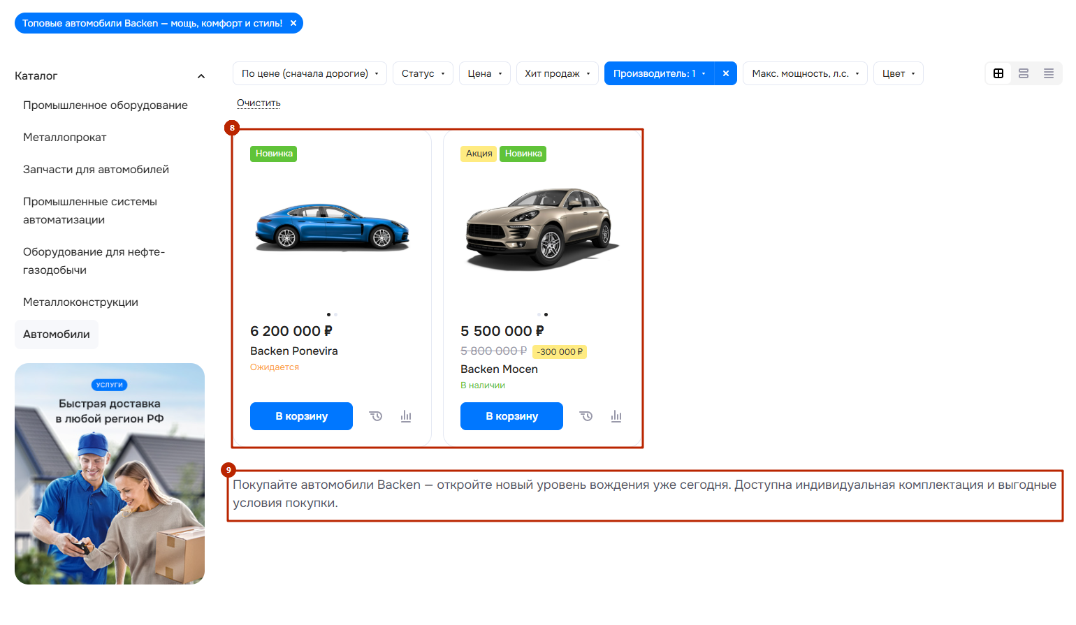 Клиент сможет увидеть посадочную страницу в каталоге, даже если у него нет на нее ссылки. Попасть на посадочную страницу он сможет сразу после того, как выберет заданную вами фильтрацию. Например, перейдет в раздел «Автомобили» и выберет в умном фильтре товары бренда Backen.