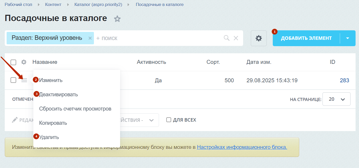 Изменить посадочную страницу в каталоге можно только через административную часть сайта. Перейдите в Контент (1) → Каталог (aspro.priority2) (2) → Посадочные в каталоге (3).