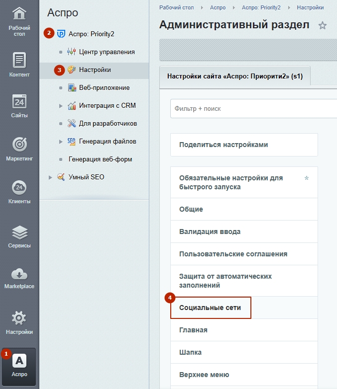 Аспро (1) → Аспро: Priority2 (2) → Настройки (3) → Социальные сети (4).