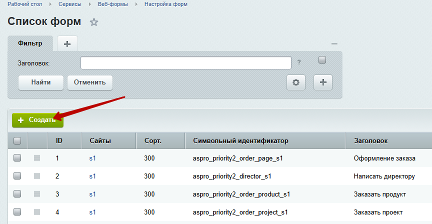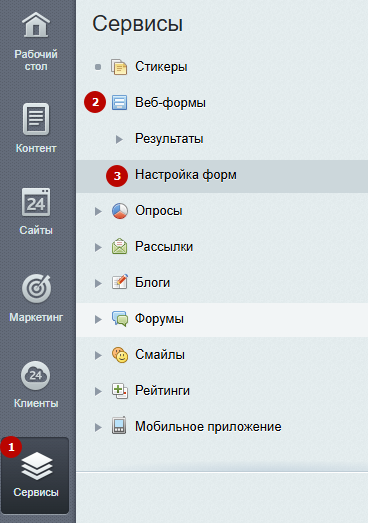 Для создания пользовательской веб-формы в административной части сайта перейдите в Сервисы (1) → Веб-формы (2) → Настройка форм (3).