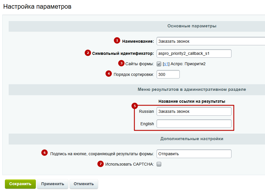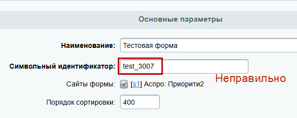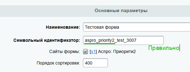 Проверьте символьный идентификатор формы. Он обязательно должен быть уникальным и начинаться с названия вашего решения. В нашем случае будет: «aspro_priority2_name_form».