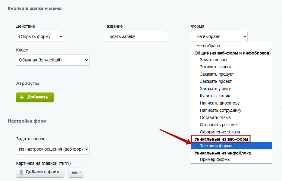 В группе настроек «Кнопка в шапке и меню» найдите поле «Форма» и выберите в нем созданную уникальную форму. Отметим, что все пользовательские веб-формы отображаются под заголовком «Уникальные из веб-форм».