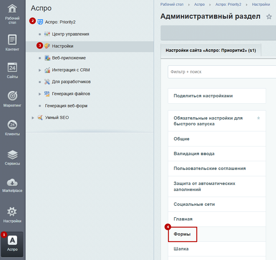 Теперь добавим форму на кнопку в шапке сайта. Для этого перейдите в Аспро (1) → Аспро: Priority2 (2) → Настройки (3) → Формы (4).
