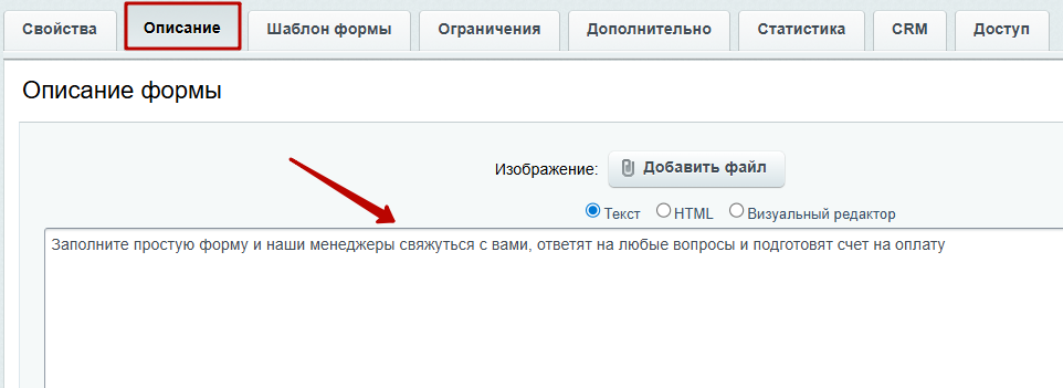Во вкладке «Описание» добавьте описание к форме.