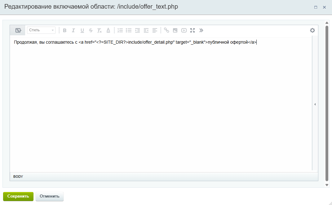 По умолчанию файл с условиями публичной оферты находится в папке include. Не забудьте изменить текст с учетом данных вашей компании в файле «offer_detail.php».