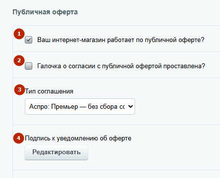 Найдите блок «Публичная оферта». Здесь вы увидите пункты, включающие уведомления, и кнопку вызова редактора подписи. В них вы сможете активировать поля: