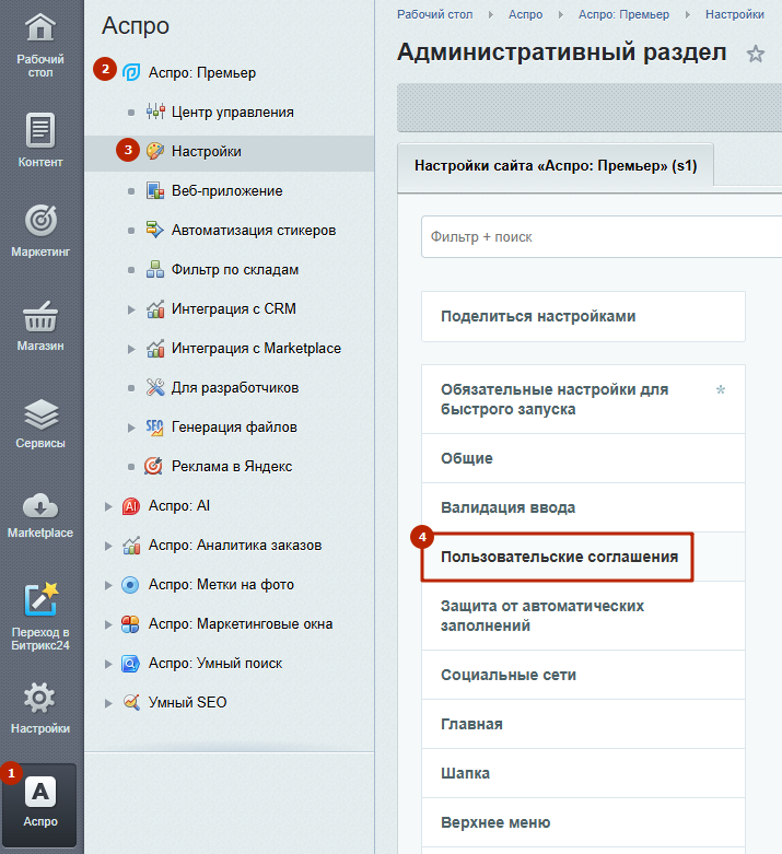 Чтобы настроить чекбокс публичной оферты, в административном разделе перейдите в Аспро (1) → Аспро: Премьер (2) → Настройки (3) → Пользовательские соглашения (4).