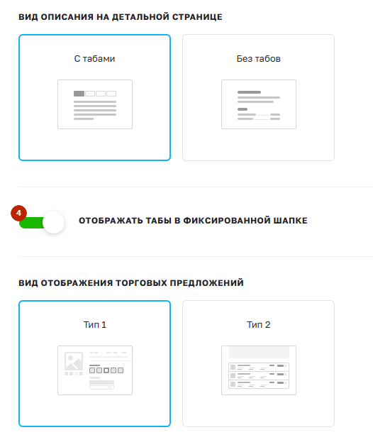 Здесь представлена та же настройка, что мы рассматривали ранее. Выберите нужное в поле «Отображать информацию о товаре в фиксированной шапке на детальной странице товара», при необходимости активируйте отображение табов и нажмите «Применить».