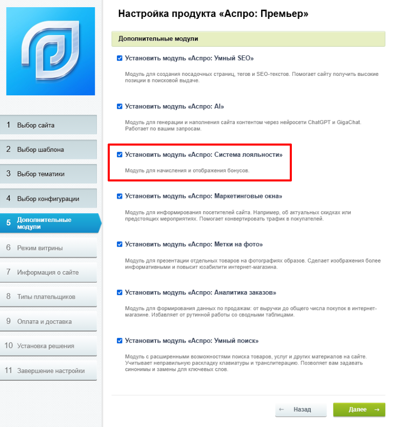 Если вы только устанавливаете сайт на решении Аспро: Премьер, то возможность установки модуля появляется еще в «Мастере настроек». Достаточно поставить галку в поле «Установить модуль Аспро: Система лояльности».