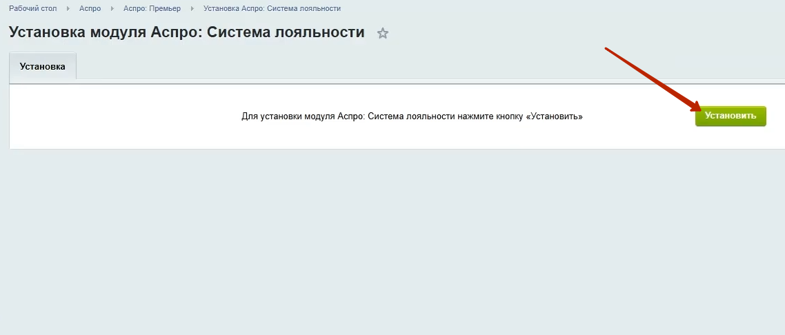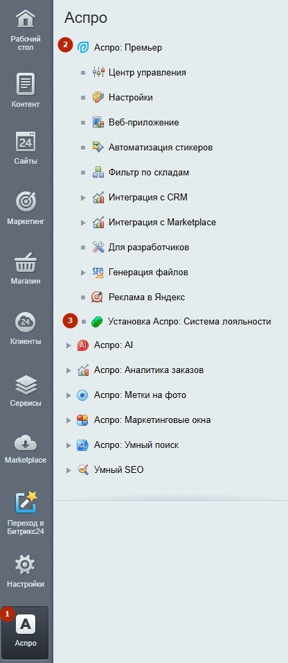 Если сайт уже есть, а вы только установили версию 1.9.0, то модуль автоматически не устанавливается. Для этого перейдите в Аспро (1) → Аспро: Премьер (2) → Установка Аспро: Система лояльности (3).