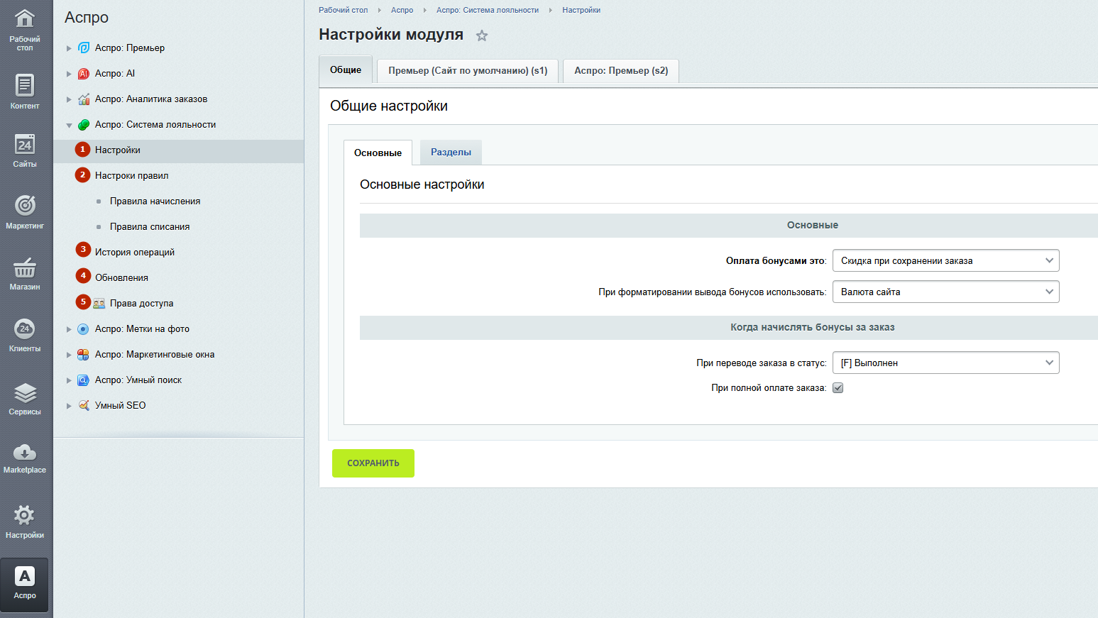 После установки появятся настройки модуля (1), правил (2), история операций с бонусами, обновления модуля (4) и прав доступа (5). Подробнее о настройках модуля в следующем уроке.
