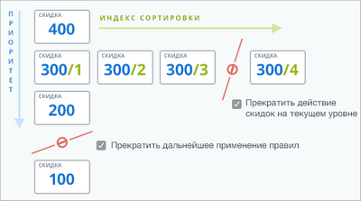 Сначала применяются скидки с наибольшим приоритетом, а если приоритет совпадает, то в порядке увеличения сортировки.