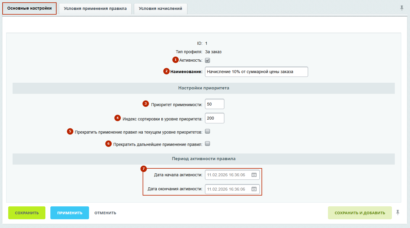 Задать приоритет применимости для правила. Чем выше значение, тем раньше правило будет применено для расчёта получаемых бонусов.