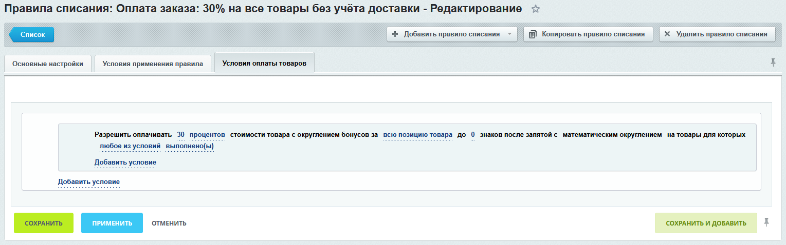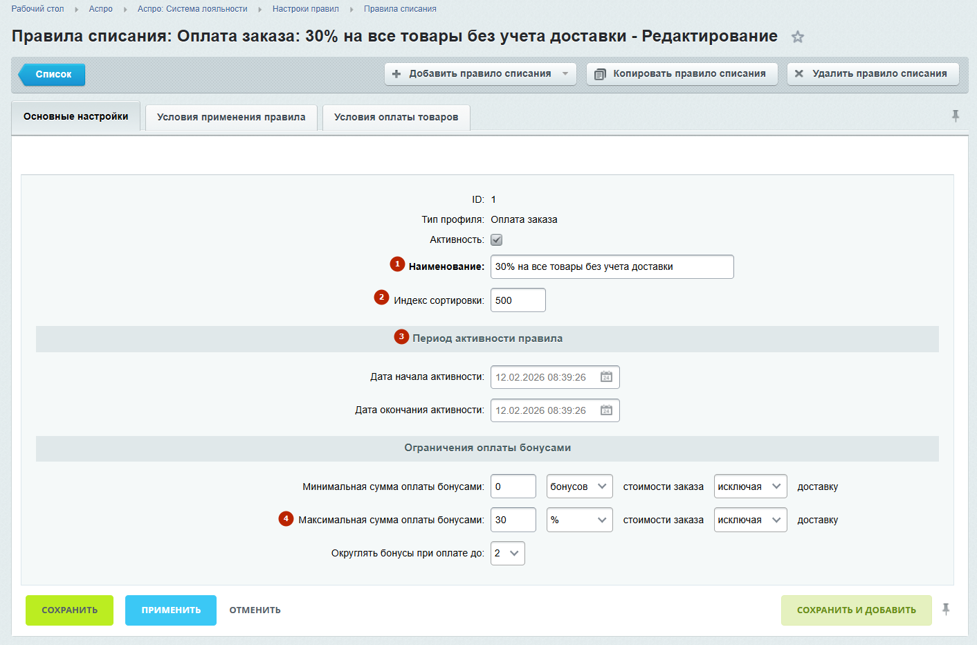 Создадим новое правило, дадим ему понятное название (1). Установим правилу средний индекс, чтобы впоследствии было проще настроить другие правила. Не будем накладывать ограничения на дату действия (3), так правило будет действовать всегда. Не будем накладывать ограничения минимальную сумму оплаты и установим максимальную сумму оплаты в 30% от стоимости заказа без учета доставки (4).