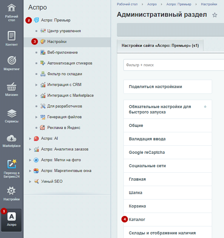 Чтобы вывести информацию об НДС, в административной части сайта перейдите в Аспро (1) → Аспро: Премьер (2) → Настройки (3) → Каталог (4).